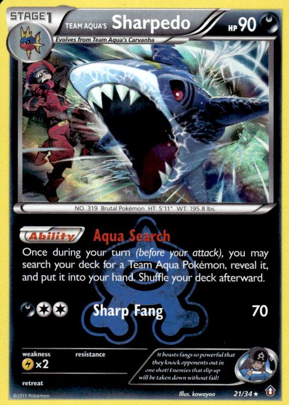 The Team Aqua's Sharpedo 2015 XY: Double Crisis #21/34 Holo card in Raw TCG (Lightly Played) condition has moved down -$3.56 (-50.4%) in the last 30 days and was last sold for $3.50 .