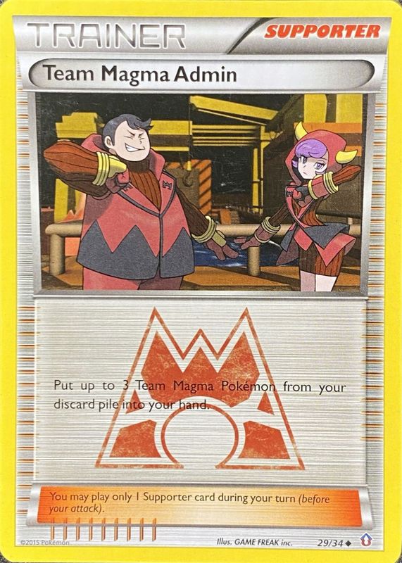 The Team Magma Admin 2015 XY: Double Crisis #29/34 Base card in Raw TCG (Lightly Played) condition has not changed in price in the last 30 days and was last sold for $1.55 .