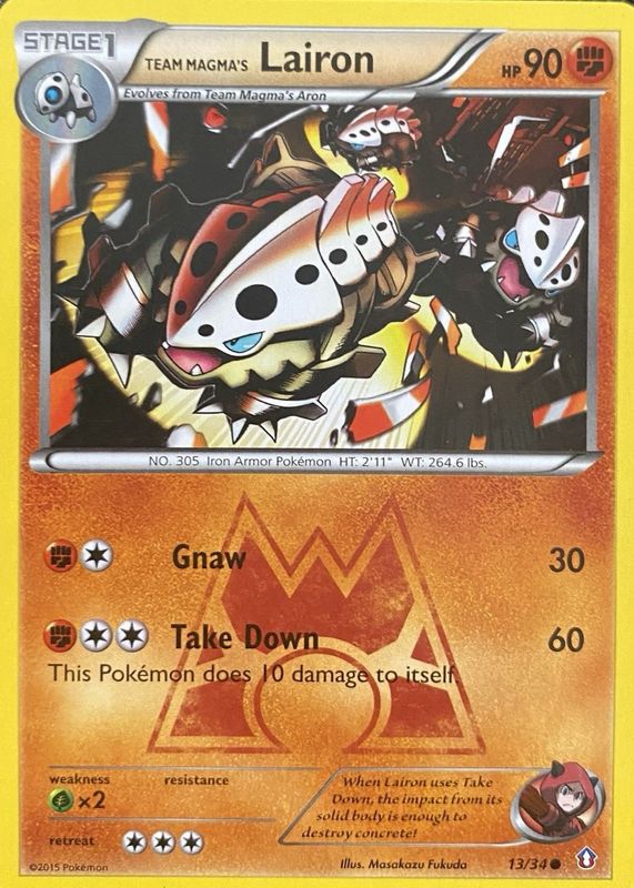 The Team Magma's Lairon 2015 XY: Double Crisis #13/34 Base card in Raw TCG (Near Mint) condition has not changed in price in the last 30 days and was last sold for $3.51 .
