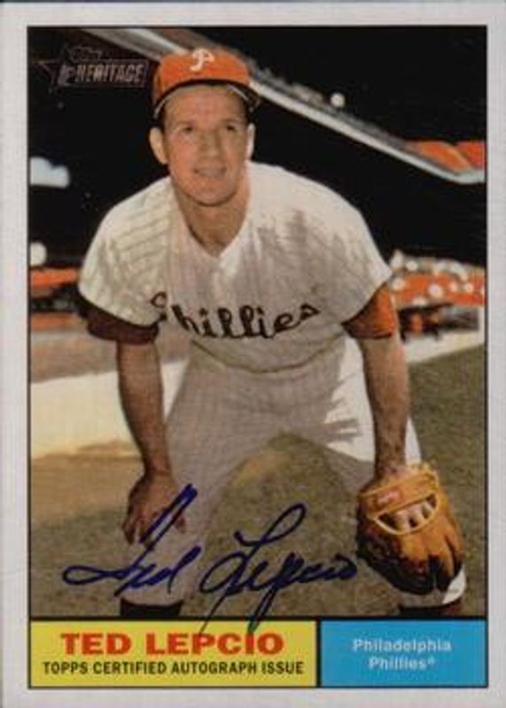 The Ted Lepcio 2010 Topps Heritage #ROATL Real One Autographs card is 1 of 5 Ted Lepcio's card variations in the 2010 Topps Heritage set being tracked by Sports Card Investor, including #234 50th Anniversary Buybacks, #ROA-TL Real One Autographs, #ROATL Real One Autographs - Red Ink /61, and #ROA-TL Real One Autographs - Red Ink /61.