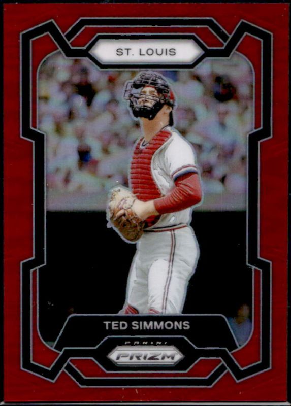 The Ted Simmons 2024 Prizm #145 Red /299 card is 1 of 30 Ted Simmons' card variations in the 2024 Prizm set being tracked by Sports Card Investor, including Base, Blue Ice, Green, Green Ice, and Pink Ice.