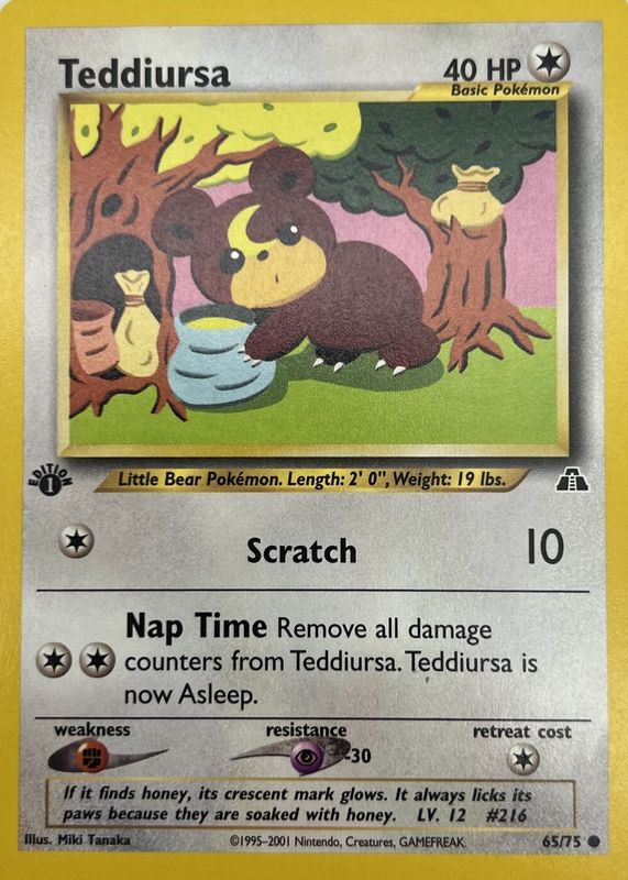 The Teddiursa 2001 Neo Discovery #65/75 1st Edition card in Raw TCG (Near Mint) condition has moved down -$4.18 (-51.4%) in the last 30 days and was last sold for $3.95 .