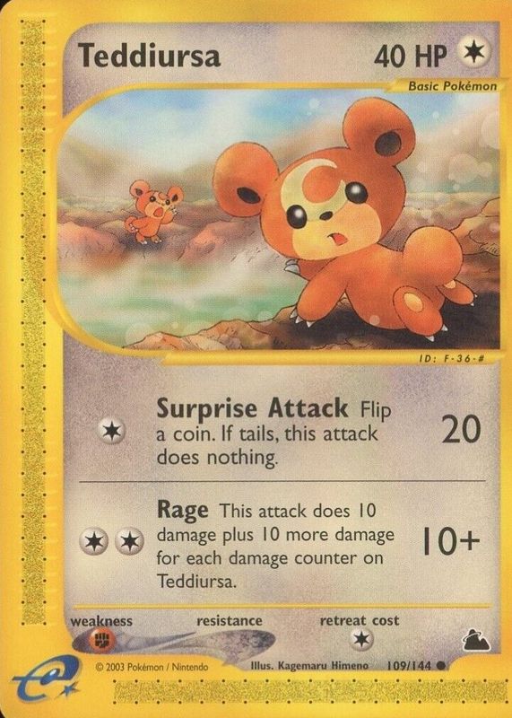 The Teddiursa 2003 Skyridge #109/144 Base card in Raw TCG (Near Mint) condition has moved down -$2.00 (-10.5%) in the last 30 days and was last sold for $16.99 .