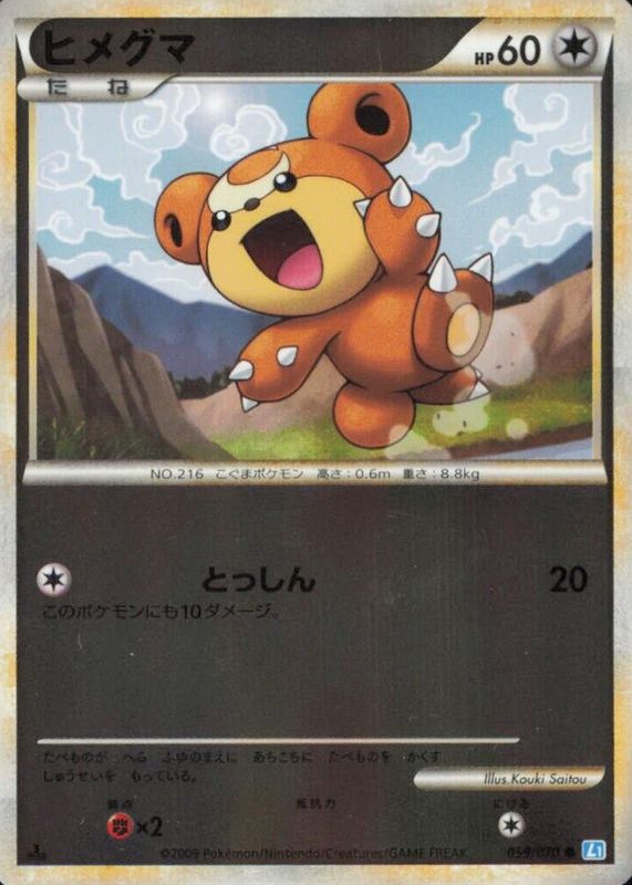 The Teddiursa 2009 Japanese HeartGold & SoulSilver: SoulSilver Collection #059/070 1st Edition Reverse Holo card in Raw TCG (Near Mint) condition has not changed in price in the last 30 days and was last sold for $9.74 .