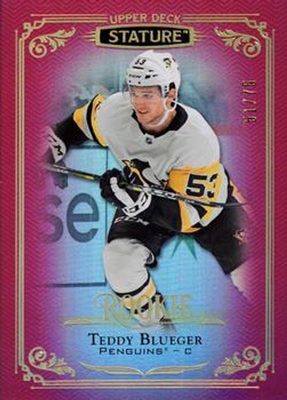 The Teddy Blueger 2019 Upper Deck Stature #187 Red /75 Rookie card is 1 of 16 Teddy Blueger's card variations in the 2019 Upper Deck Stature set being tracked by Sports Card Investor, including Base /399, Autographs /199, Green /149, Autographs Green /85, and Portrait Variant /85.