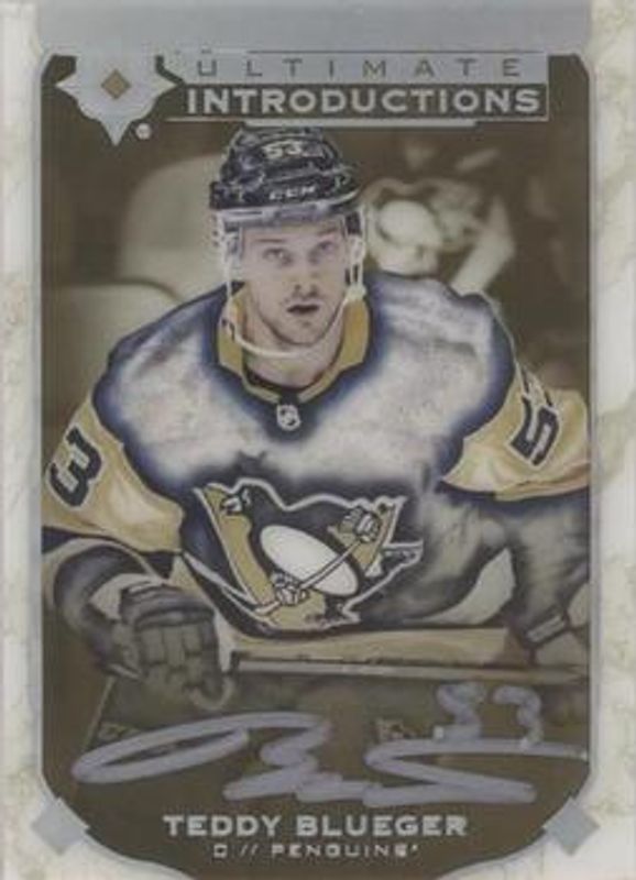 The Teddy Blueger 2019 Upper Deck Ultimate Collection #UI-36 Ultimate Introductions Gold Autographs Rookie card is 1 of 11 Teddy Blueger's card variations in the 2019 Upper Deck Ultimate Collection set being tracked by Sports Card Investor, including Base /299, Autographed Shields /1, Ultimate Introductions, Ultimate Rookies Jersey /399, and Autographed Debut Threads /99.