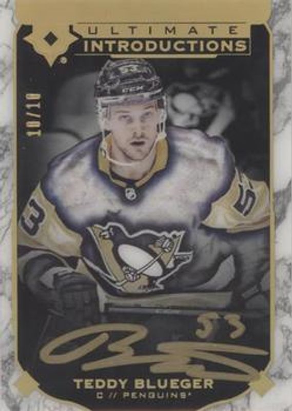 The Teddy Blueger 2019 Upper Deck Ultimate Collection #UI-36 Ultimate Introductions Onyx Black Autographs /10 Rookie card is 1 of 11 Teddy Blueger's card variations in the 2019 Upper Deck Ultimate Collection set being tracked by Sports Card Investor, including Base /299, Autographed Shields /1, Ultimate Introductions, Ultimate Introductions Gold Autographs, and Ultimate Rookies Jersey /399.