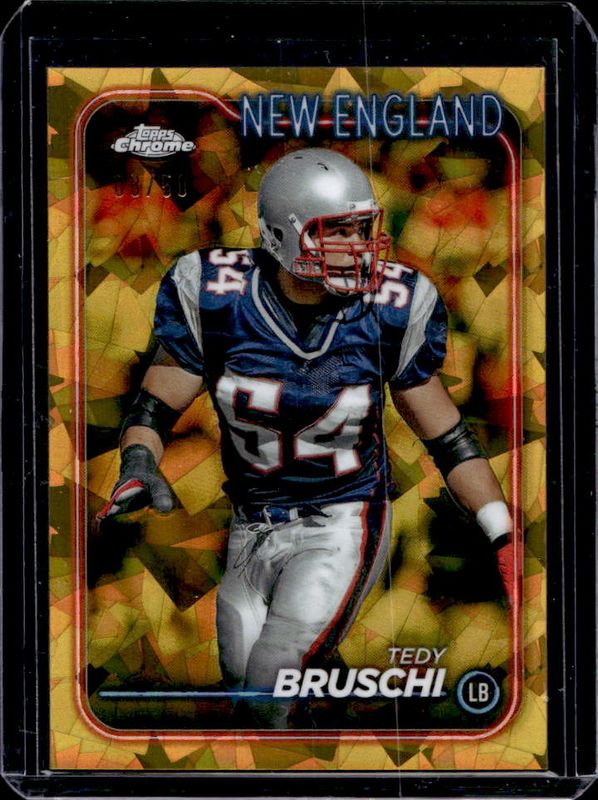 The Tedy Bruschi 2024 Topps Chrome Sapphire Edition #124 Gold /50 card is 1 of 7 Tedy Bruschi's card variations in the 2024 Topps Chrome Sapphire Edition set being tracked by Sports Card Investor, including Base, Orange /25, White /15, Purple /10, and Red /5.