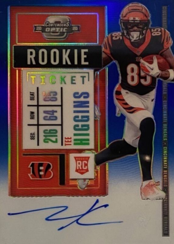The Tee Higgins 2020 Contenders Optic #113 Rookie Ticket Auto - Blue /75 card in Raw condition has not changed in price in the last 30 days and was last sold for $112.51 .