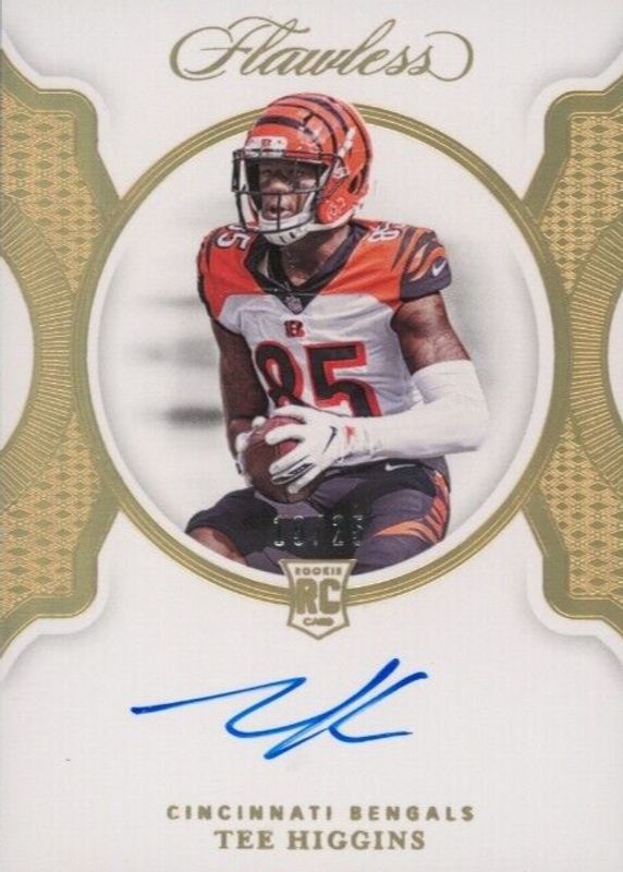 The Tee Higgins 2020 Flawless #FRS-THI Flawless Rookie Signatures (/25) card in Raw condition has not changed in price in the last 30 days and was last sold for $100.00 .
