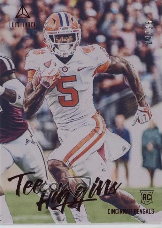 This card is 1 of 9 Tee Higgins' card variations in the 2020 Luminance set being tracked by Sports Card Investor, including Base, Gold (Rookie) /250, Blue /99, Green /75, and Orange /50.