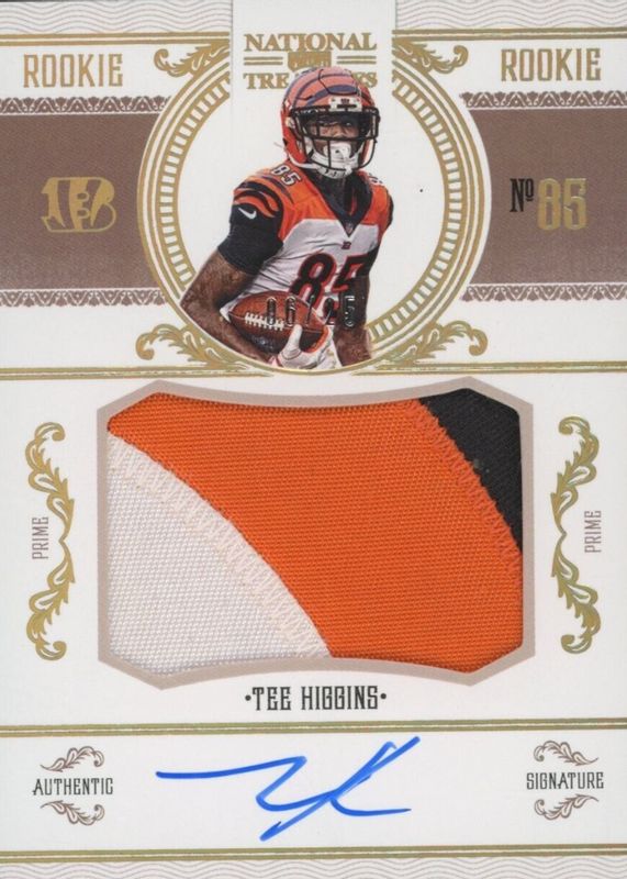 This card is 1 of 49 Tee Higgins' card variations in the 2020 National Treasures set being tracked by Sports Card Investor, including Rookie Patch Auto /99, Rookie Patch Auto - Green Jersey Number (/85), Rookie Patch Auto - Holo Silver /25, Rookie Patch Auto - Midnight /20, and Rookie Patch Auto - Stars & Stripes /20.