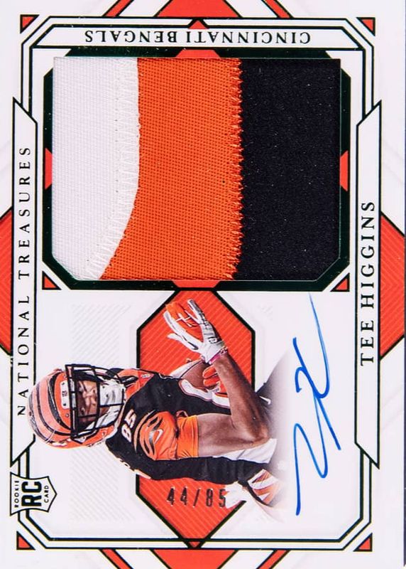 This card is 1 of 49 Tee Higgins' card variations in the 2020 National Treasures set being tracked by Sports Card Investor, including Rookie Patch Auto /99, Rookie Patch Auto - Green Jersey Number (/85), Rookie Patch Auto - Holo Silver /25, Rookie Patch Auto - Midnight /20, and Rookie Patch Auto - Stars & Stripes /20.