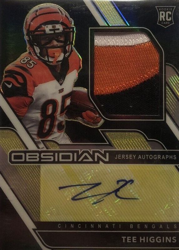 This card is 1 of 20 Tee Higgins' card variations in the 2020 Obsidian set being tracked by Sports Card Investor, including Rookie Autographs (/150), Rookie Autographs - Electric Etch Green (/50), Rookie Autographs - Electric Etch Orange (/75), Rookie Autographs - Electric Etch Red (/10), and Rookie Autographs - Electric Etch Yellow (/25).