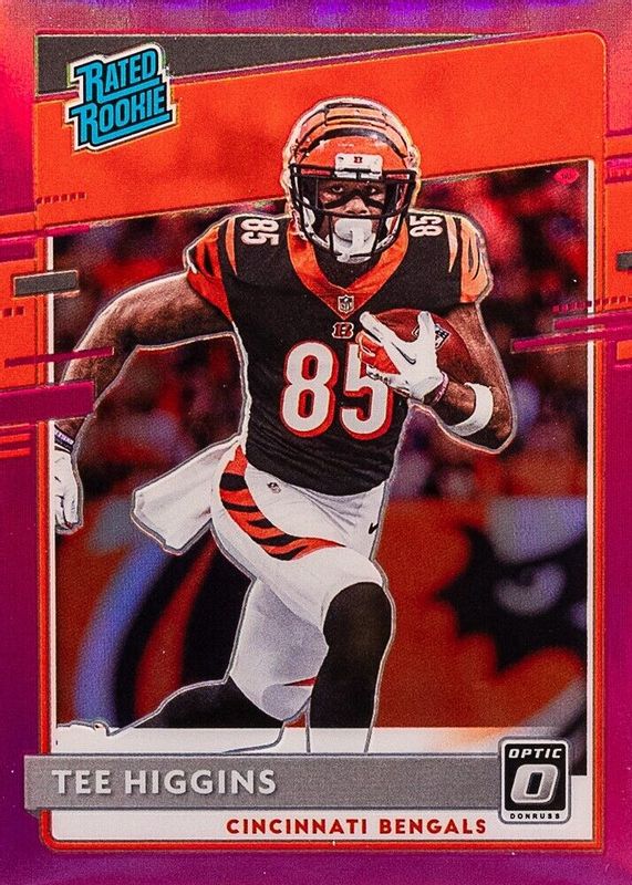 The Tee Higgins 2020 Optic #160 Pink Rookie card in Raw condition has moved up $0.51 (+25.6%) in the last 30 days and was last sold for $2.50 .