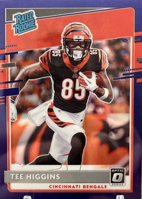 The Tee Higgins 2020 Optic #160 Purple /50 Rookie card in Raw condition has not changed in price in the last 30 days and was last sold for $20.50 .