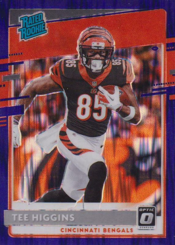 The Tee Higgins 2020 Optic #160 Purple Shock Rookie card in Raw condition has moved up $18.08 (+1,264%) in the last 30 days and was last sold for $19.51 .