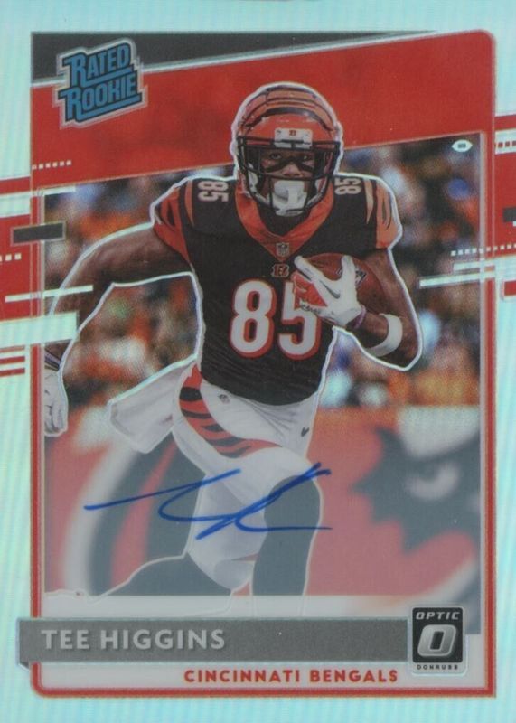 The Tee Higgins 2020 Optic #160 Rated Rookie Autographs - Holo /99 card in Raw condition has not changed in price in the last 30 days and was last sold for $89.00 .