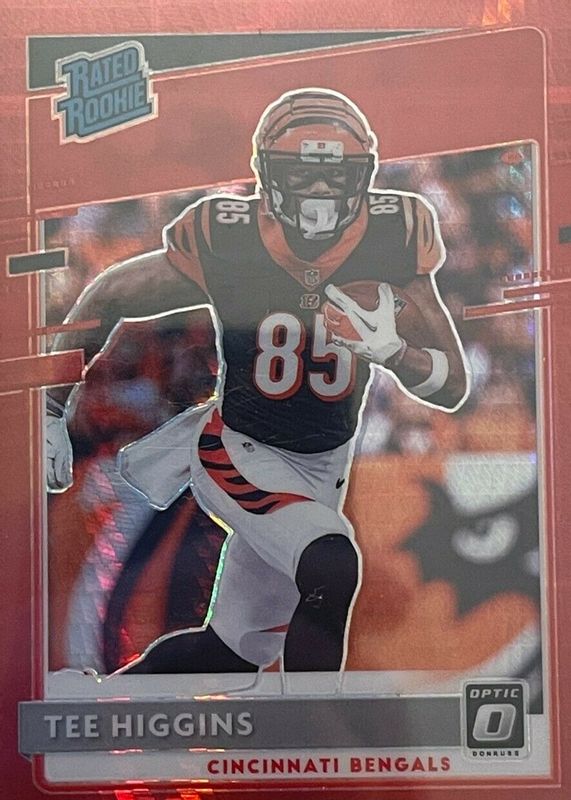 The Tee Higgins 2020 Optic #160 Red Hyper Rookie card in Raw condition has moved up $0.99 (+24.8%) in the last 30 days and was last sold for $4.99 .