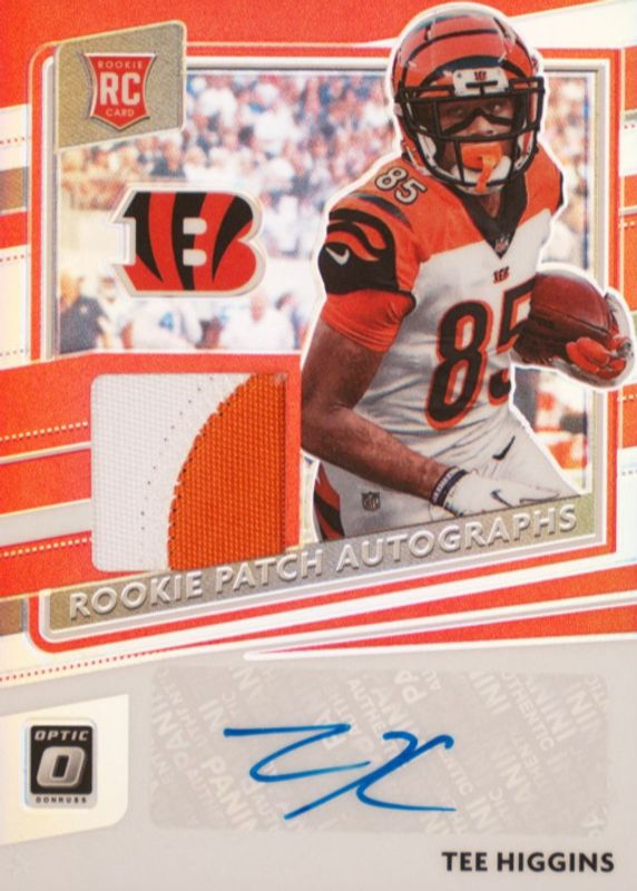 The Tee Higgins 2020 Optic #RPA-TE Rookie Patch Auto /25 card in Raw condition has not changed in price in the last 30 days and was last sold for $53.00 .