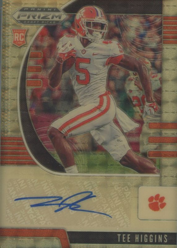 The Tee Higgins 2020 Prizm Draft Picks #107 Autographs - Gold Vinyl /5 Rookie card in Raw condition has not changed in price in the last 30 days and was last sold for $85.00 .