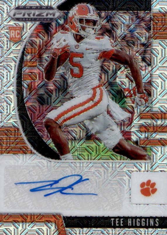 The Tee Higgins 2020 Prizm Draft Picks #107 Autographs - Mojo /49 Rookie card in Raw condition has not changed in price in the last 30 days and was last sold for $50.00 .
