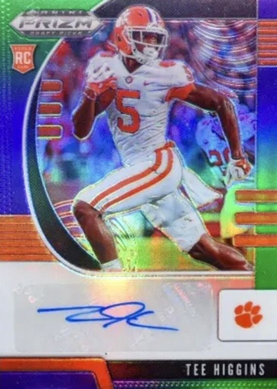 The Tee Higgins 2020 Prizm Draft Picks #107 Autographs - Purple & Green (/199) Rookie card in Raw condition has not changed in price in the last 30 days and was last sold for $31.94 .