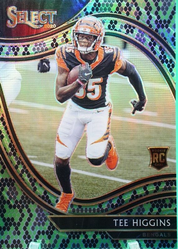 The Tee Higgins 2020 Select #360 Field Level Green & Black Snakeskin /2 Rookie card in Raw condition has not changed in price in the last 30 days and was last sold for $232.50 .