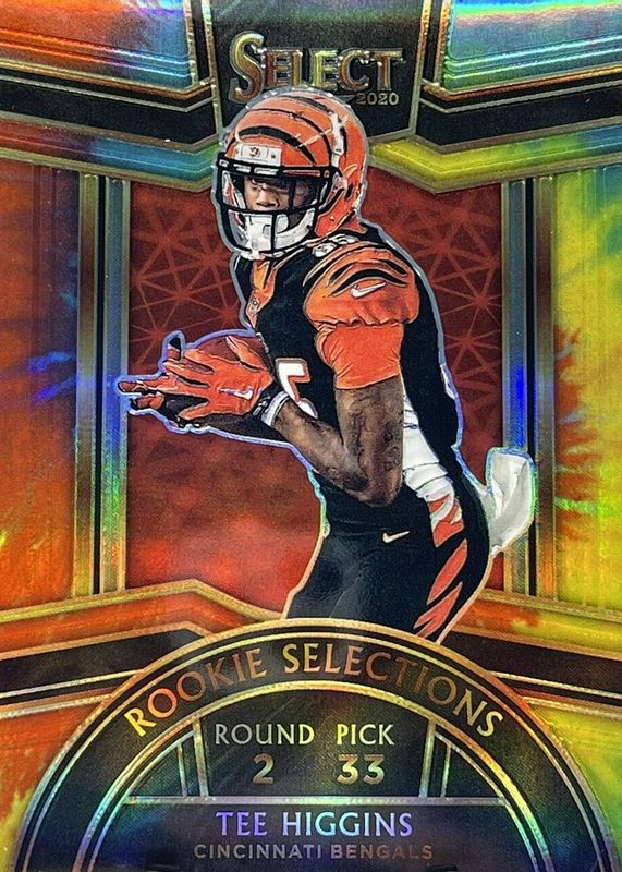 The Tee Higgins 2020 Select #13 Rookie Selections - Tie-Dye /25 card in Raw condition has not changed in price in the last 30 days and was last sold for $41.00 .