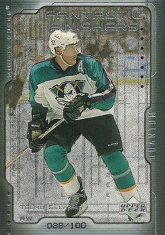 The Teemu Selanne 1999 Upper Deck #FF6 Fantastic Finishers Quantum Silver /100 card is 1 of 34 Teemu Selanne's card variations in the 1999 Upper Deck set being tracked by Sports Card Investor, including #153 Base, #174 Base, #153 UD Exclusives /100, #174 UD Exclusives /100, and #153 UD Exclusives 1/1 /1.