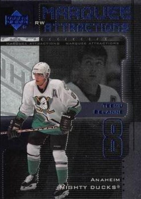 The Teemu Selanne 1999 Upper Deck #MA12 Marquee Attractions card is 1 of 34 Teemu Selanne's card variations in the 1999 Upper Deck set being tracked by Sports Card Investor, including #153 Base, #174 Base, #153 UD Exclusives /100, #174 UD Exclusives /100, and #153 UD Exclusives 1/1 /1.