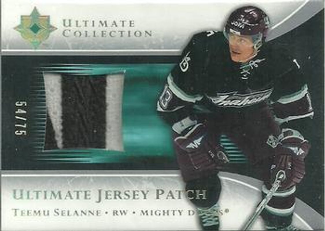 The Teemu Selanne 2005 Upper Deck Ultimate Collection #P-TS Ultimate Patches /75 card is 1 of 8 Teemu Selanne's card variations in the 2005 Upper Deck Ultimate Collection set being tracked by Sports Card Investor, including Base /599, Gold /25, Jerseys /250, National Heroes Jerseys /225, and Premium Swatches /75.