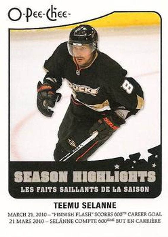 The Teemu Selanne 2010 O-Pee-Chee #SH-8 Season Highlights card is 1 of 6 Teemu Selanne's card variations in the 2010 O-Pee-Chee set being tracked by Sports Card Investor, including Base, Retro, Retro Blank Back, Retro Rainbow, and Retro Black Rainbow /100.