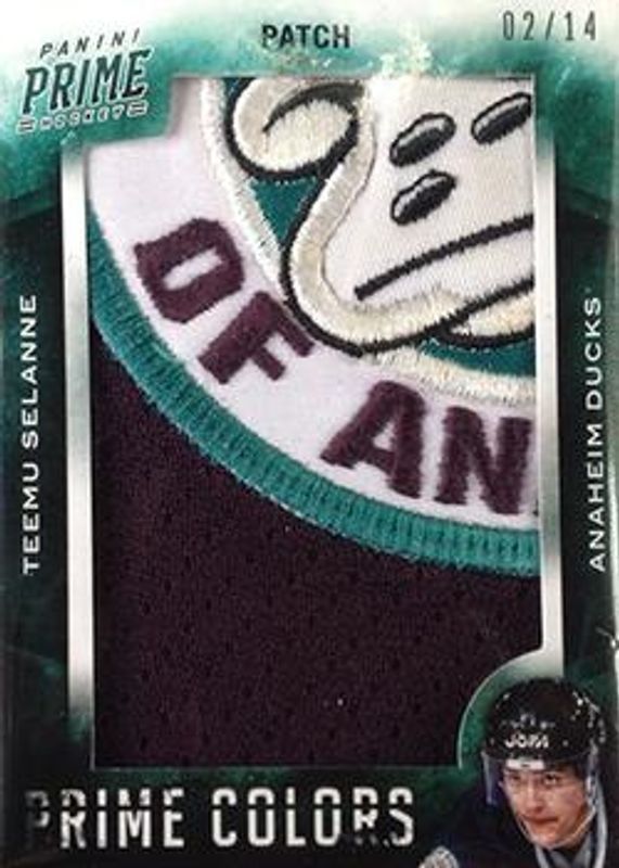 The Teemu Selanne 2013 Prime #PC-TSEL Prime Colors Patch /27 card is 1 of 10 Teemu Selanne's card variations in the 2013 Prime set being tracked by Sports Card Investor, including Prime Signatures /99, Prime Colors Numbers /69, Prime Colors Logo /28, Prime Signatures - Gold /25, and Prime Signatures Holosilver /10.