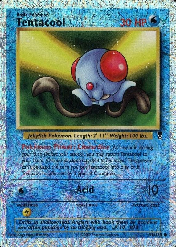 The Tentacool 2002 Legendary Collection #96 Reverse Holo card in Raw TCG (Near Mint) condition has moved down -$45.35 (-47.6%) in the last 30 days and was last sold for $50.00 .