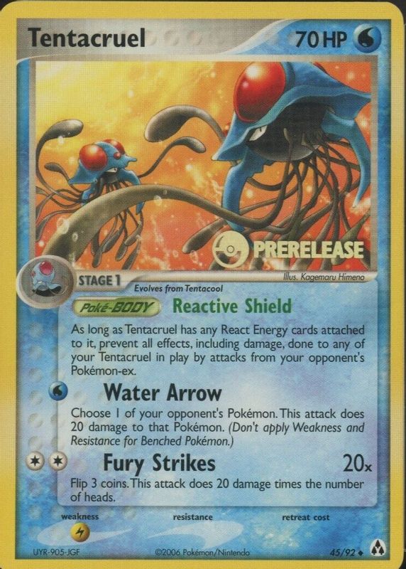The Tentacruel 2006 EX: Legend Maker #45/92 Promo (Prerelease) card in Raw TCG (Near Mint) condition has moved down -$4.80 (-9.4%) in the last 30 days and was last sold for $46.00 .
