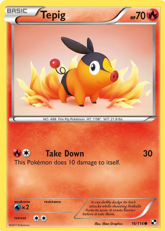 The Tepig 2011 Black & White #016/114 Base card in Raw TCG (Lightly Played) condition has moved up $0.38 (+27.7%) in the last 30 days and was last sold for $1.75 .