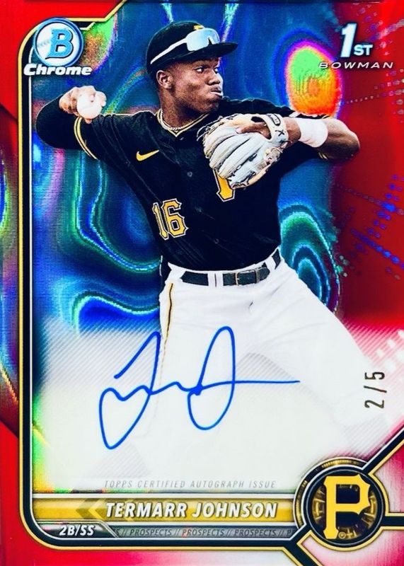 The Termarr Johnson 2022 Bowman Draft #CDA-TJ Chrome DP Auto - Red Lava Refractor /5 (1st) card in Raw condition has not changed in price in the last 30 days and was last sold for $4,444.44 .