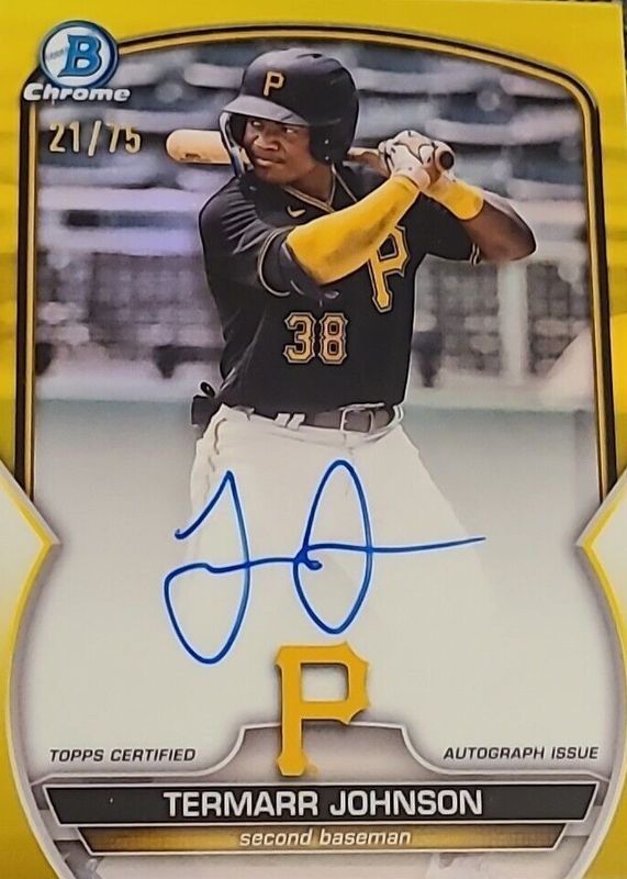 The Termarr Johnson 2023 Bowman #CPA-TJ Chrome Prospect Auto - Yellow Refractor /75 card in Raw condition has not changed in price in the last 30 days and was last sold for $89.38 .