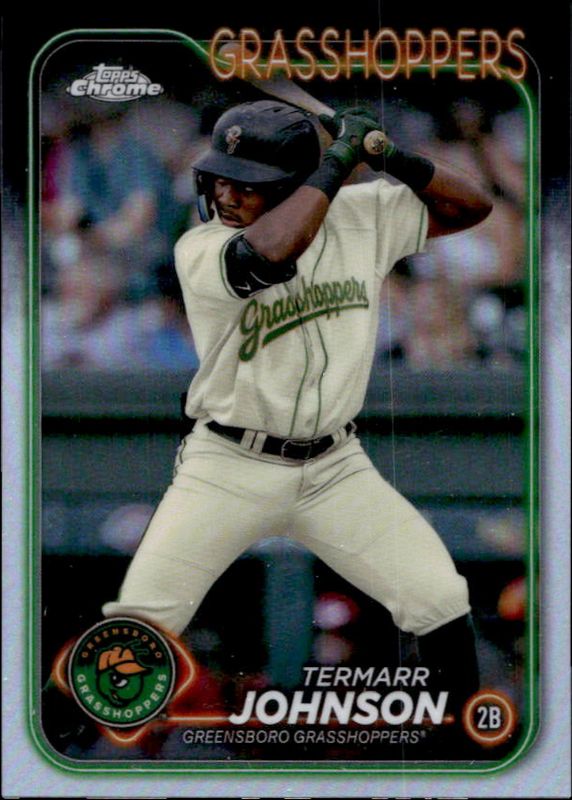 The Termarr Johnson 2024 Topps Pro Debut #PDC-175 Chrome card is 1 of 50 Termarr Johnson's card variations in the 2024 Topps Pro Debut set being tracked by Sports Card Investor, including Base, Fuchsia Foil /199, Sparkle Foil /175, Blue Foil /150, and Green Foil /99.