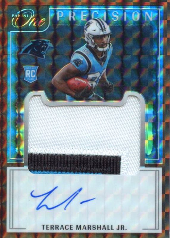 This card is 1 of 14 Terrace Marshall Jr.'s card variations in the 2021 One set being tracked by Sports Card Investor, including Precision Rookie Patch Autographs (/75), Precision Rookie Patch Autographs - Blue (/49), Precision Rookie Patch Autographs - Gold (/15), Precision Rookie Patch Autographs - Red (/25), and Premium Rookie Patch Autographs (/49).