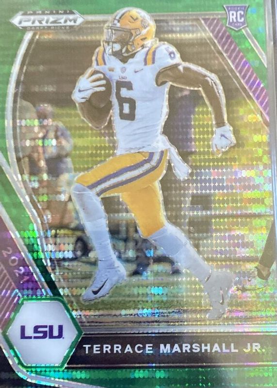The Terrace Marshall Jr. 2021 Prizm Draft Picks #157 Green Pulsar /25 Rookie card in Raw condition has not changed in price in the last 30 days and was last sold for $10.00 .