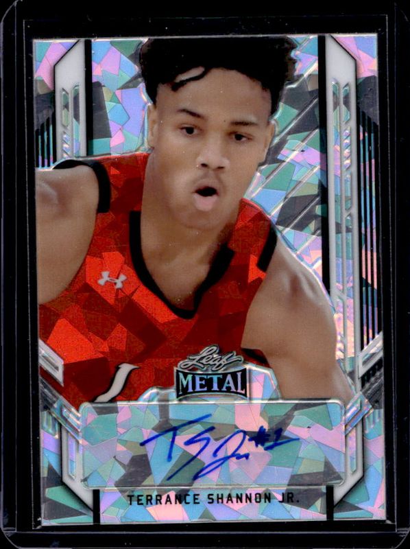 The Terrance Shannon Jr. 2021 Leaf Metal #PA-TS1 Portrait Autographs - Silver Crystal card is 1 of 88 Terrance Shannon Jr.'s card variations in the 2021 Leaf Metal set being tracked by Sports Card Investor, including Base, Silver Crystal, Silver Mojo, Silver Wave, and Blue Rainbow /50.