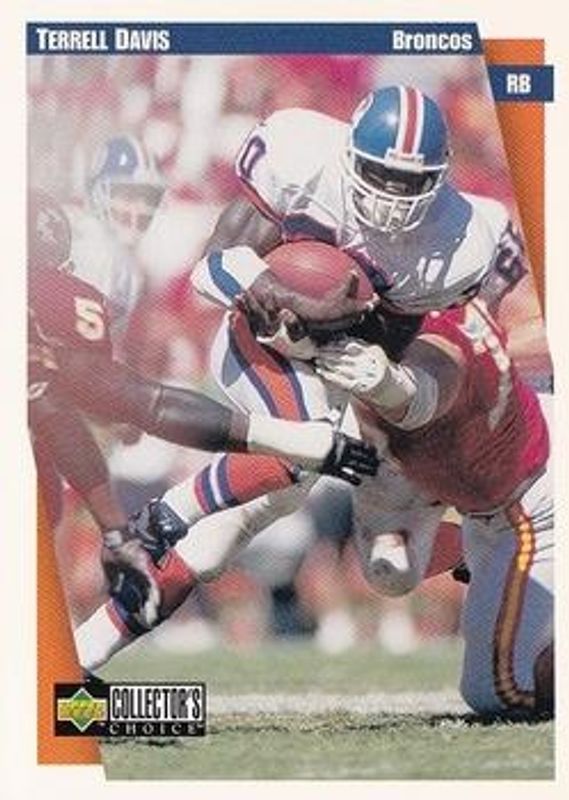 The Terrell Davis 1997 Upper Deck Collector's Choice #118 Base card is 1 of 13 Terrell Davis' card variations in the 1997 Upper Deck Collector's Choice set being tracked by Sports Card Investor, including Base, Jumbos 3x5, Memorable Moments, Names of the Game 3x5, and Names of the Game 5x7.