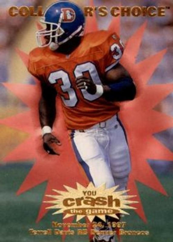 The Terrell Davis 1997 Upper Deck Collector's Choice #C25c You Crash the Game card is 1 of 13 Terrell Davis' card variations in the 1997 Upper Deck Collector's Choice set being tracked by Sports Card Investor, including #118 Base, #53 Base, #3 Jumbos 3x5, #3 Memorable Moments, and #5 Names of the Game 3x5.