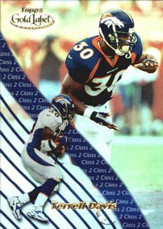 The Terrell Davis 2000 Topps Gold Label #26 Class 2 card is 1 of 5 Terrell Davis' card variations in the 2000 Topps Gold Label set being tracked by Sports Card Investor, including Base, Class 3, Premium /1000, and Holiday Match Ups Fall.