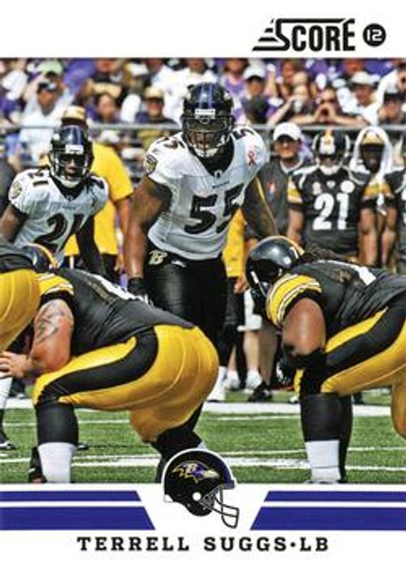 The Terrell Suggs 2012 Score #167 Glossy card is 1 of 15 Terrell Suggs' card variations in the 2012 Score set being tracked by Sports Card Investor, including Base, Gold Zone, Scorecard, Artist's Proof /32, and Red Zone /20.