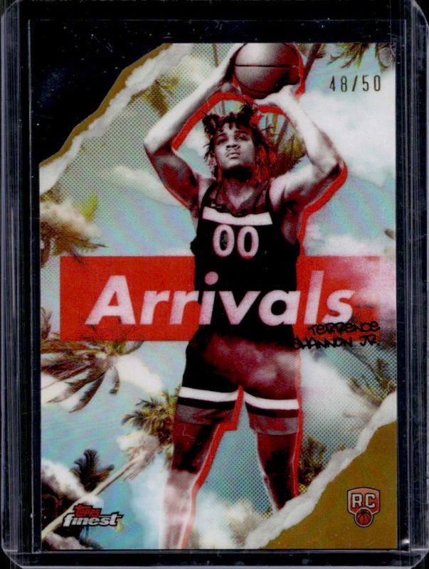 The Terrence Shannon Jr. 2024 Topps Finest #A-25 Arrivals - Gold Refractor /50 Rookie card is 1 of 117 Terrence Shannon Jr.'s card variations in the 2024 Topps Finest set being tracked by Sports Card Investor, including Arrivals, Arrivals - Geometric Refractor, Arrivals - Refractor, Arrivals - X-Fractor, and Base Rare.