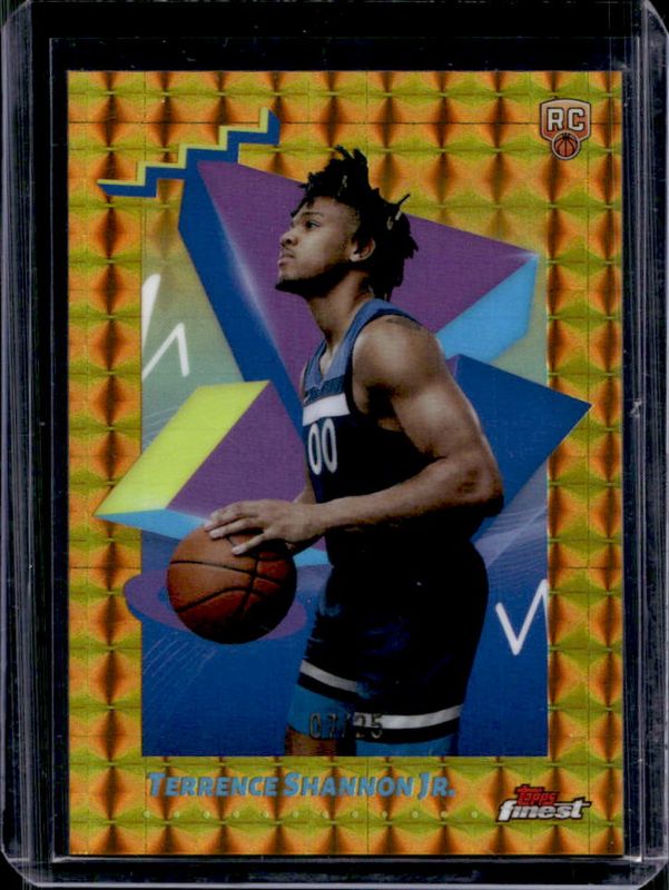 The Terrence Shannon Jr. 2024 Topps Finest #155 Base Uncommon - Gold Geometric Refractor /25 Rookie card is 1 of 117 Terrence Shannon Jr.'s card variations in the 2024 Topps Finest set being tracked by Sports Card Investor, including Arrivals, Arrivals - Geometric Refractor, Arrivals - Refractor, Arrivals - X-Fractor, and Base Rare.