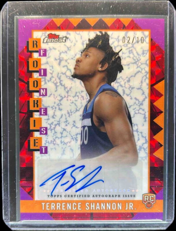 The Terrence Shannon Jr. 2024 Topps Finest #RFA-TSH Rookie Finest Autographs - Red Black Geometric Refractor /10 card is 1 of 117 Terrence Shannon Jr.'s card variations in the 2024 Topps Finest set being tracked by Sports Card Investor, including Arrivals, Arrivals - Geometric Refractor, Arrivals - Refractor, Arrivals - X-Fractor, and Base Rare.